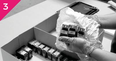 Nous nous assurons que vos cartouches ne présentent pas d’impacts, ou encore de rayures, particulièrement sur leurs têtes d'impression. Si c’est le cas, ces cartouches ne seront pas rétribuées. En effet, celles-ci ne doivent pas être endommagées pour pouvoir être réemployées. C’est notamment pourquoi il est important de bien les protéger durant le transport et de suivre nos conseils pour l'envoi de vos reprises.